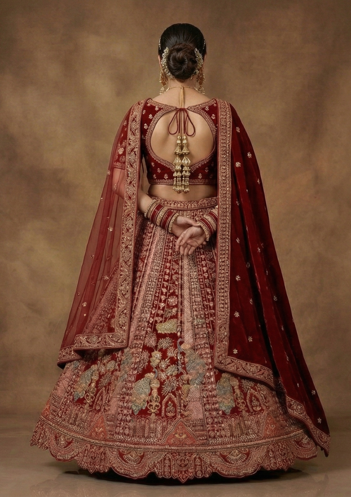Make a statement on your special day with this exquisite deep red bridal lehenga choli, crafted with intricate zari embroidery and rich traditional detailing. The elegant deep red color symbolizes grace and tradition, making it a timeless choice for brides.