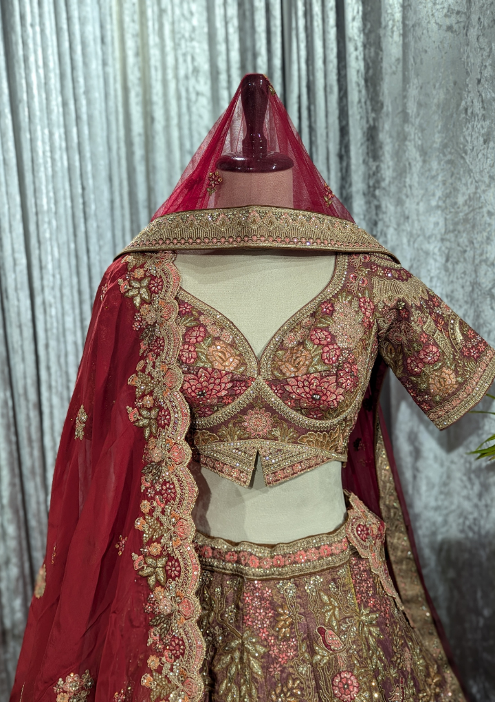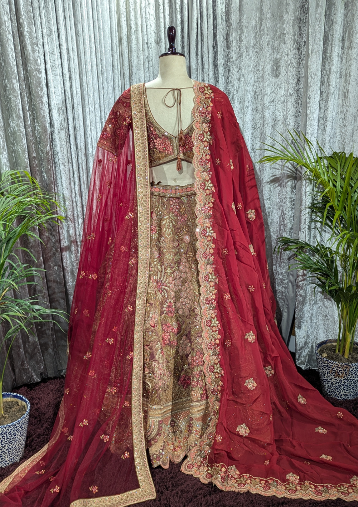 Luxurious golden gown made from fendy silk fabric. Designed to give a rich and festive look, perfect for weddings, receptions, and grand celebrations.