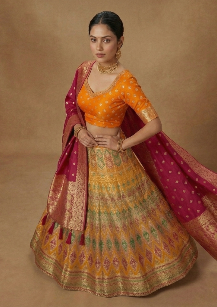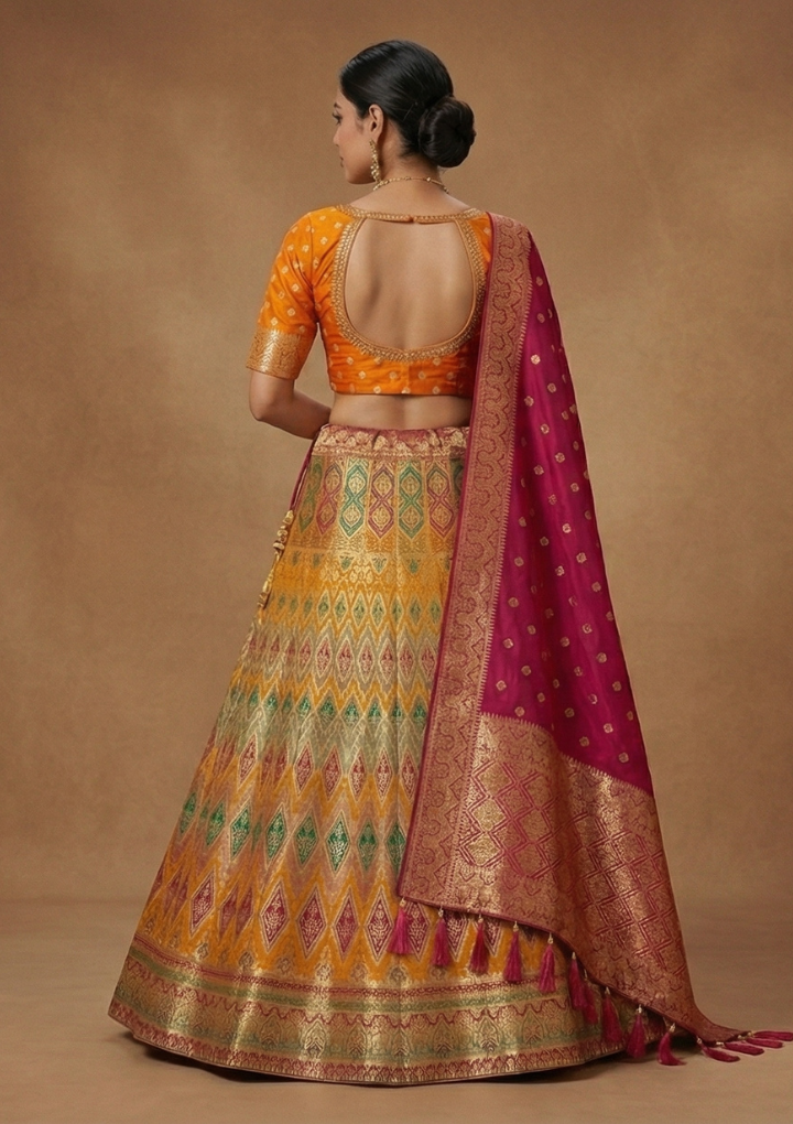Vibrant mustard yellow lehenga paired with a rich pink dupatta, featuring intricate multi-color woven patterns and zari work. Unstitched lehenga and blouse for a customizable fit. Free size suitable for waist 28 to 45 inches. Ideal for festive and wedding occasions.