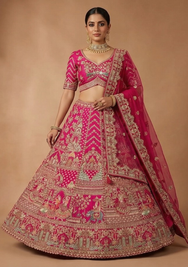 Stunning rani pink lehenga designed with rich zari embroidery and traditional motifs for a royal bridal look. Comes with unstitched lehenga and blouse for a customizable fit. Free size suitable for waist 28 to 45 inches. Perfect for weddings and festive occasions.
