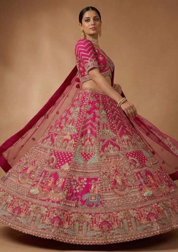 Make a royal statement with this beautiful rani pink bridal lehenga choli set, crafted with intricate zari embroidery and traditional motifs. The vibrant rani pink color adds richness and elegance, making it a perfect choice for brides and grand occasions.