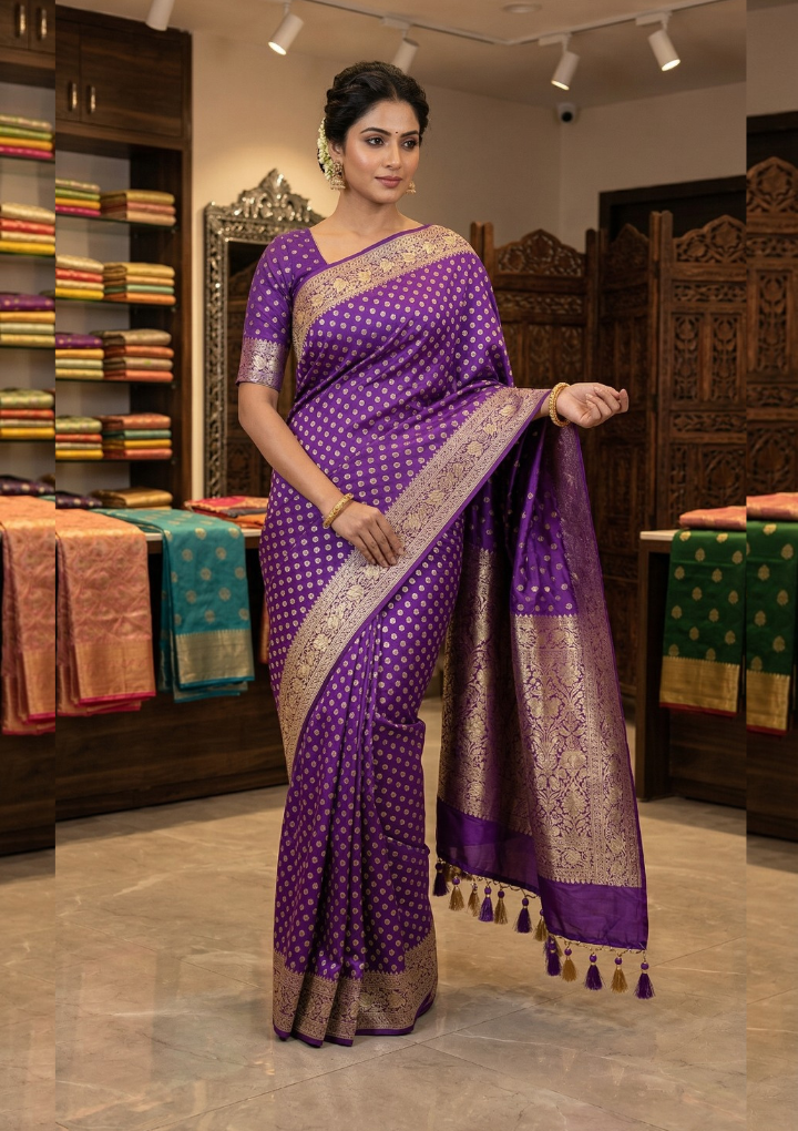 Enhance your ethnic wardrobe with this stunning Royal Purple Art Silk Saree designed with elegant gold zari buti motifs that add a touch of royal charm. The saree features a beautifully woven traditional zari border and a detailed pallu that reflects classic Indian craftsmanship.