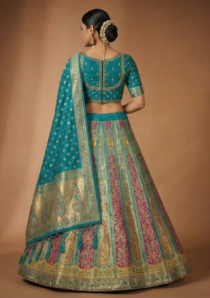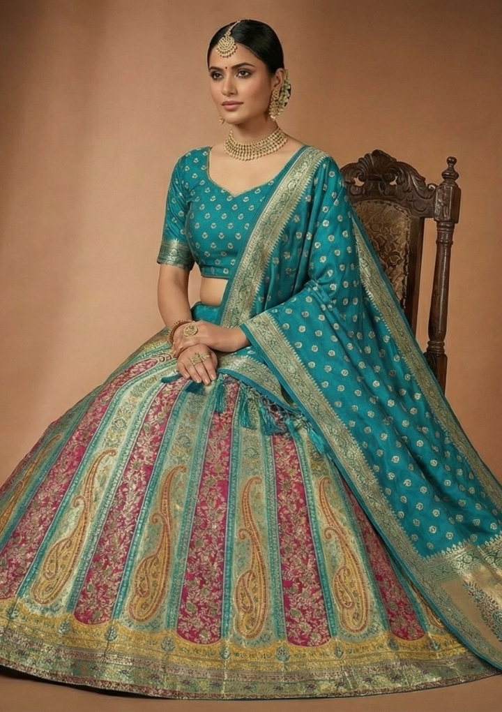 Elegant teal green lehenga designed with multi-color woven patterns and rich zari work for a vibrant ethnic look. Comes with unstitched lehenga and blouse for a customizable fit. Free size suitable for waist 28 to 45 inches. Perfect for weddings, festive, and traditional occasions.