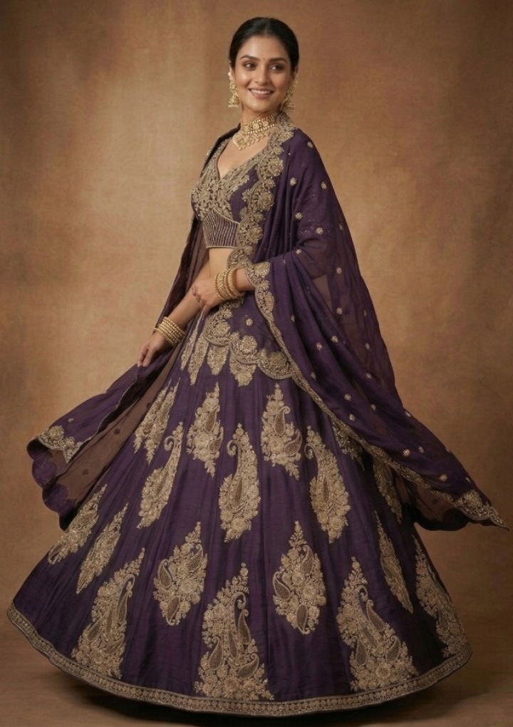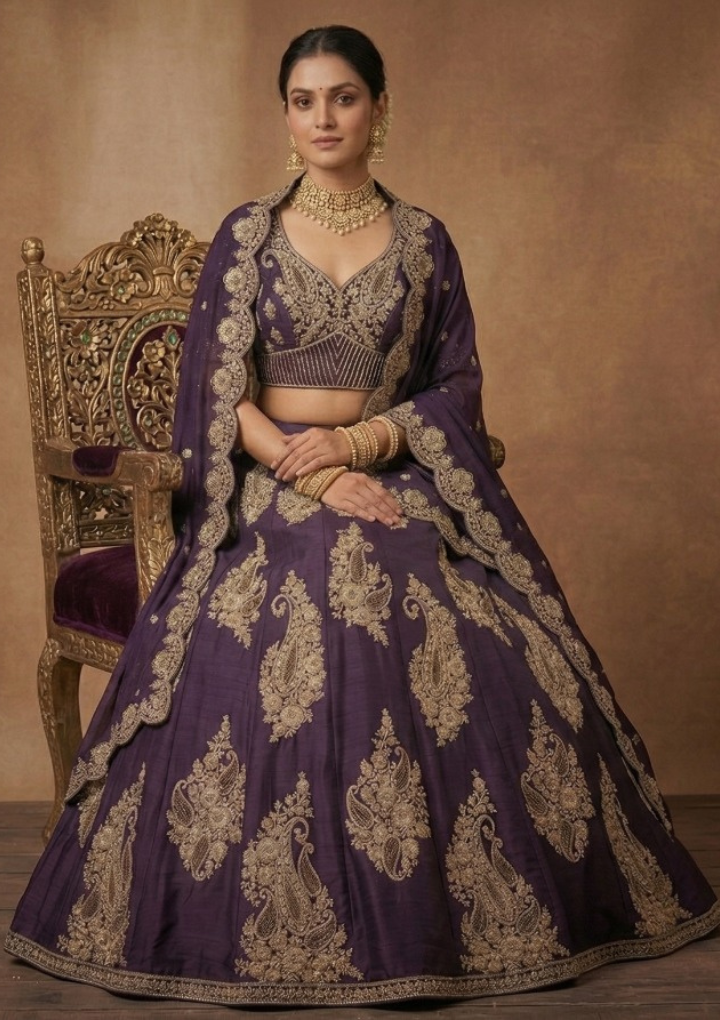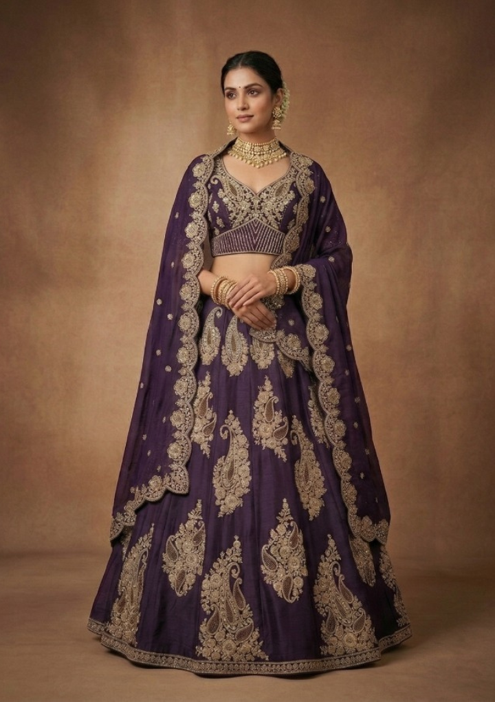 Elegant deep purple lehenga crafted in premium fabric with rich zari embroidery and intricate traditional motifs. Comes with unstitched lehenga and blouse for a customizable fit. Free size suitable for waist 28 to 45 inches. Perfect for bridal wear, weddings, and festive occasions.