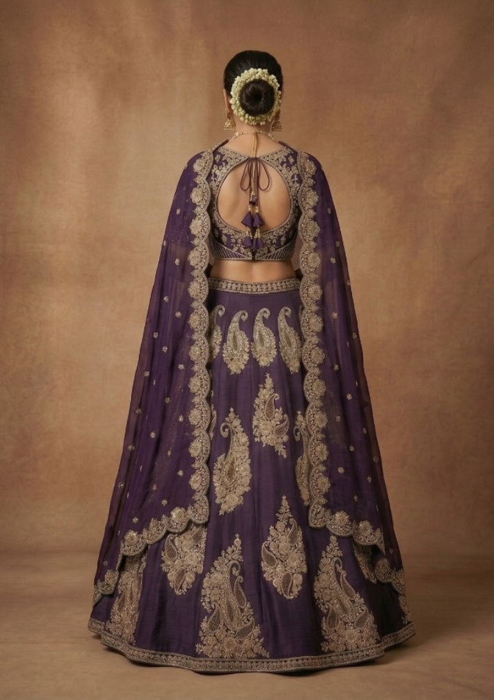 Make a bold and royal statement with this stunning deep purple bridal lehenga choli set, designed with intricate golden zari embroidery and detailed traditional paisley motifs. The rich color combined with heavy embroidery gives a luxurious and regal appearance, making it perfect for bridal and grand occasions.